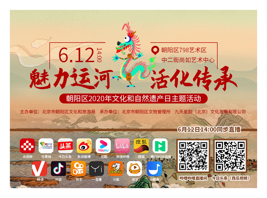 6月13日第15个“文化和自然遗产日”来临之际,为弘扬中华优秀传统文化,营造文化遗产保护良好社会氛围,推动优秀传统文化创造性转化、创新性发展,朝阳区文化和旅游局主办,九天星韵承办的“魅力运河 活化传承”线下主题活动,将于6月12日14:00在798艺术区中二街尚如艺术中心举行。